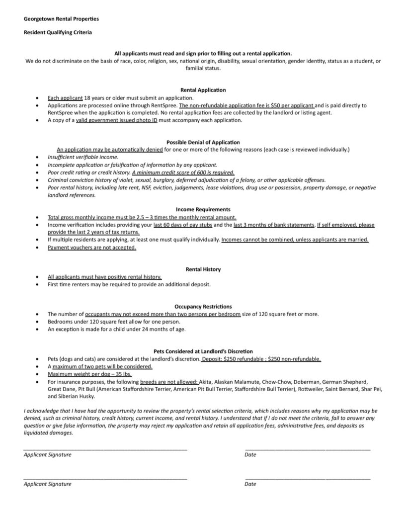 STEP 1: Save the Resident Qualifying Criteria form below. Read, sign, and date it. Send your completed form to us, via text, at: 512-784-0832 along with any questions that you may have.